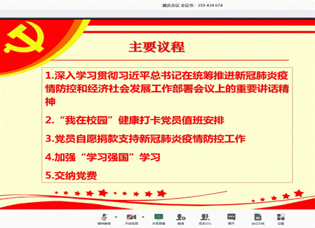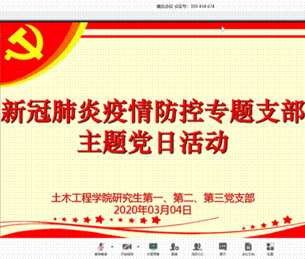 2020年03月04日星期三下午,MK体育研究生第(一、二、三)党支部在腾讯会议平台上开展线上会议,深入学习贯彻习近平总书记在统筹推进新冠肺炎疫情防控和经济社会发展工作部署会议上的重要讲话精神,与会人员有研究生支部书记陶秋旺、董腾老师以及研究生第(一、二、三)党支部员工党员。本次会议以视频会议方式进行。
