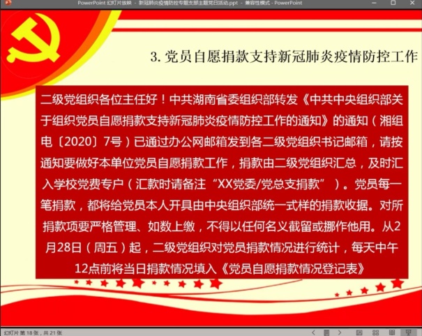 首先,第三支部书记陶秋旺老师带领全体同志一起学习习近平总书记《在统筹推进新冠肺炎疫情防控和经济社会发展工作部署会议上的讲话》。在学习过程中,着重强调了现阶段全体支部党员应在疫情防控阶段作出自己应有的贡献,在今后的工作学习中,做到习近平总书记提出的三个要求,一是狠抓工作落实,二是增强忧患意识,三是提高工作本领。随后,对“我在校园”健康打卡党员值班情况、党员自愿捐款支持新冠肺炎疫情防控工作、加强学习强国学习及缴纳党费进行了工作阐述及任务安排,第二支部书记董腾老师对员工“不得提前返校”等规定进行了解释说明,邓都、田宗坤、胡青等员工党员补充了就疫情期间主动帮助班干部做好“每日一报”、“每日健康打卡”、线上教学学风管理等工作安排。