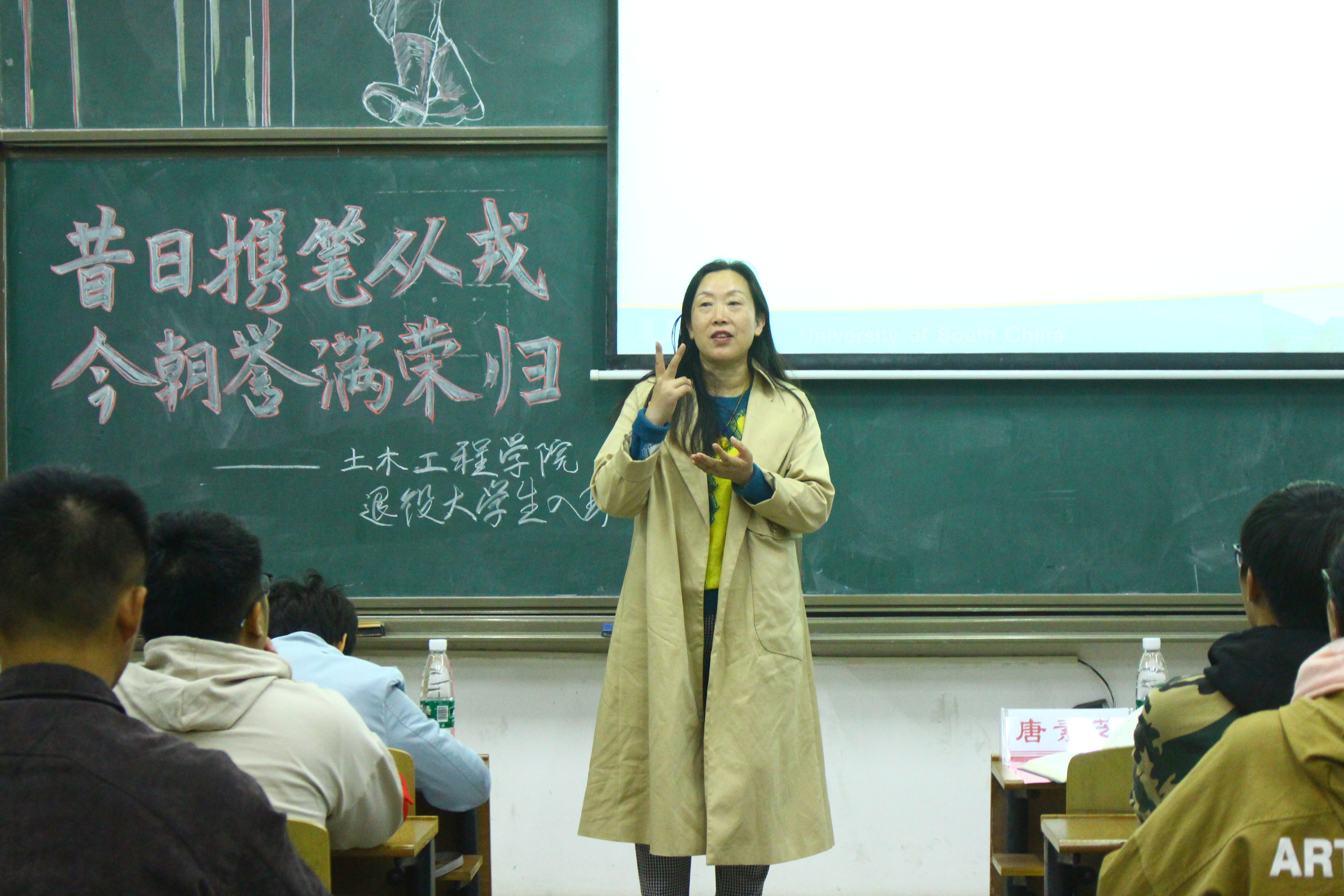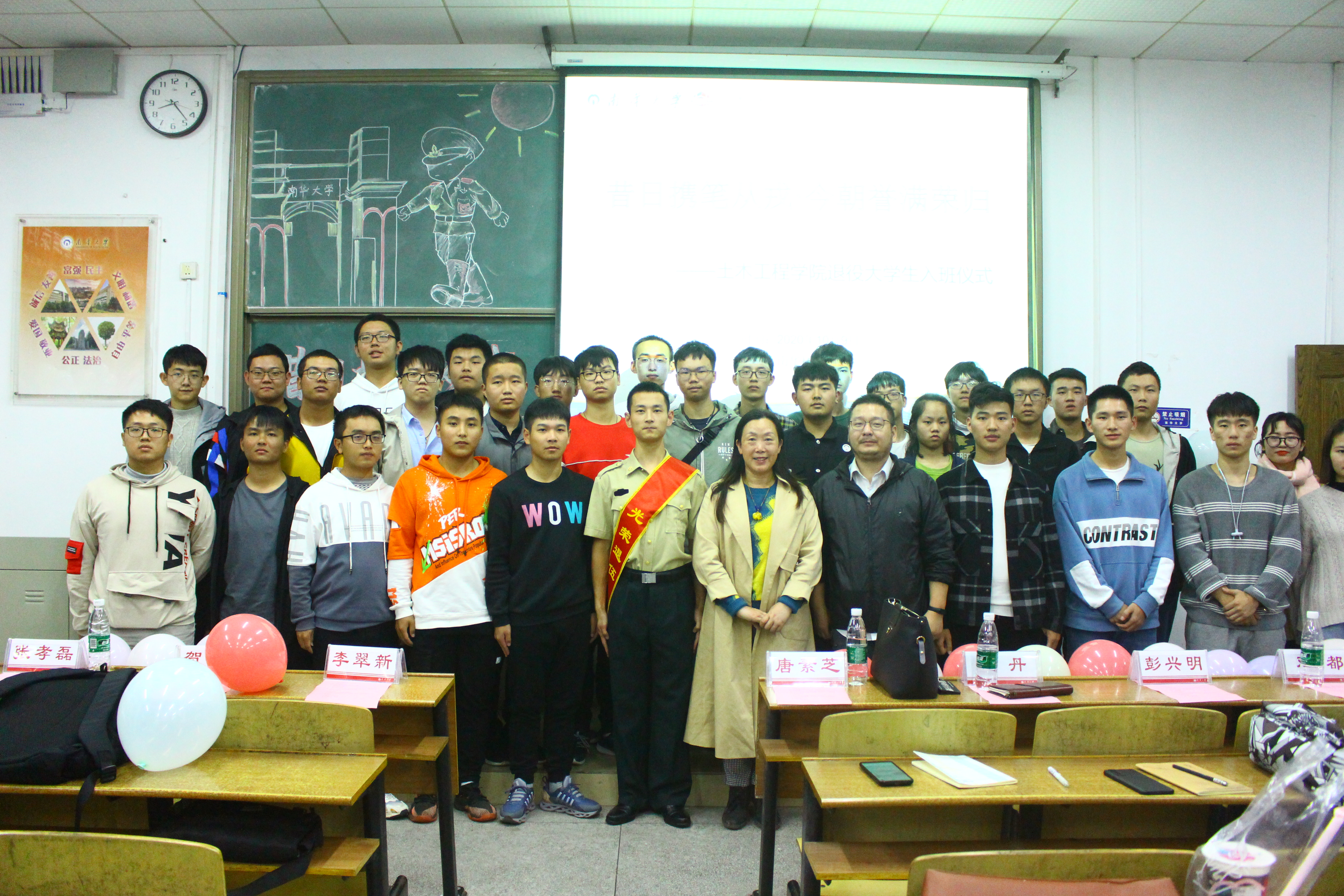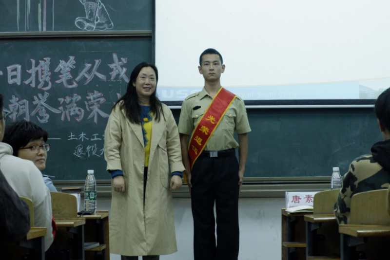 会议伊始,由两个“参军光荣”的视频正式拉开会议帷幕。紧接着,来自土木2005班的退役老员工姜泽文上台,唐素芝老师为他佩戴“光荣退伍”绶带。随后,姜泽文就两年的军旅生活分享了自己的经历与感受,他从迷茫到找到未来方向,从想过放弃到克服难关!发言结束,姜泽文与在场同学热情交流,解答同学们的疑惑,同学们也对军旅生活多了一份感慨,会议的气氛也被推向高潮。最后唐素芝老师进行总结讲话,她高度赞扬了老员工服兵役的行为,并从经济上、政治上和能力素质上总结了老员工服兵役的好处;她还谈到如姜泽文这样的退役老员工能起表率作用,发扬拼搏精神,带动全体员工共同进步!