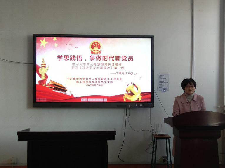 2020年10月22日下午14:30,MK体育岩土工程专业和工程造价专业员工党支部在土木楼四楼会议室开展“学思践悟,争做时代新党员”主题党日活动,深入学习习近平总书记在湖南考察的重要讲话精神,集中学习《习近平谈治国理论》第三卷,活动由支部书记李翠新老师主持,支部全部党员参加。