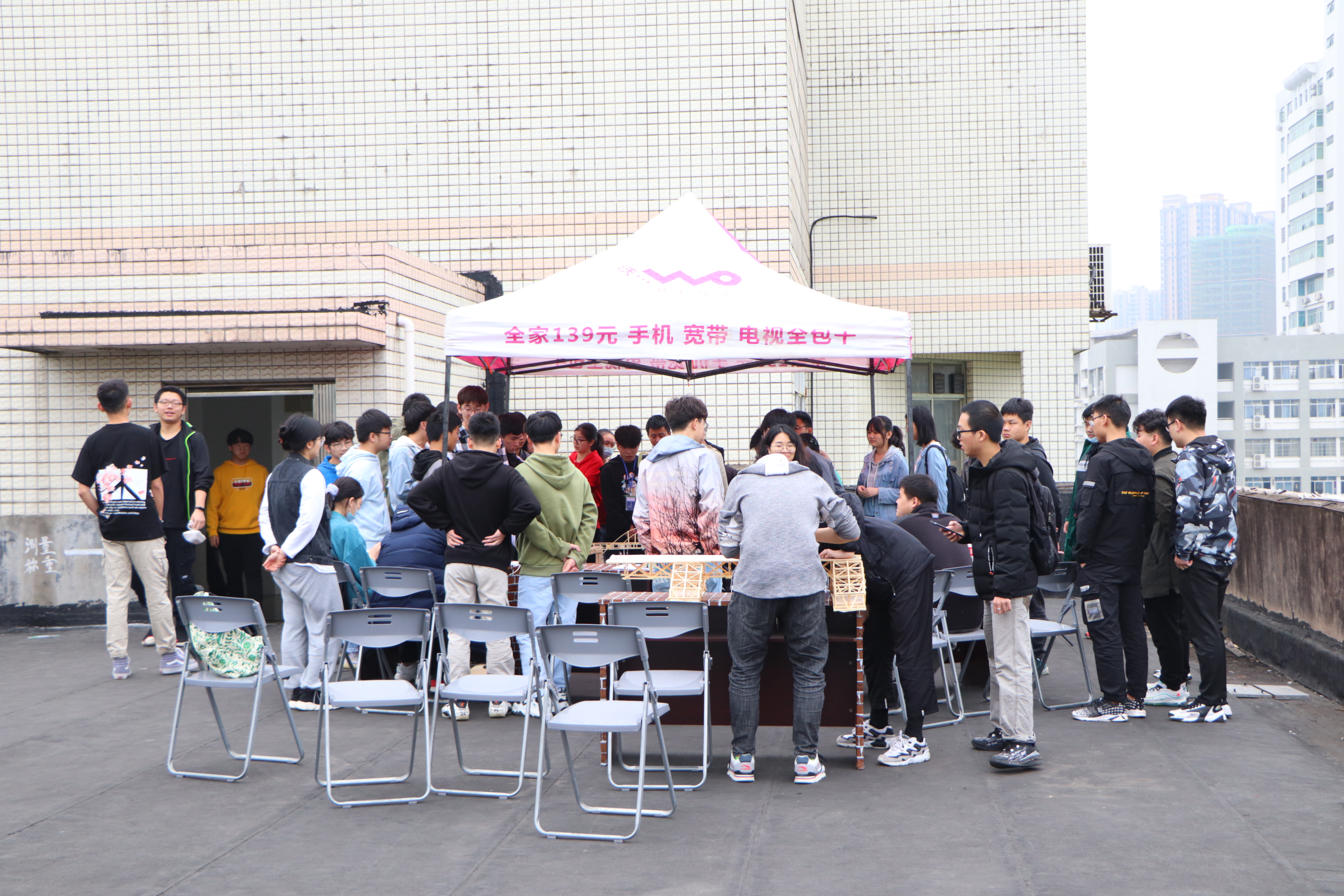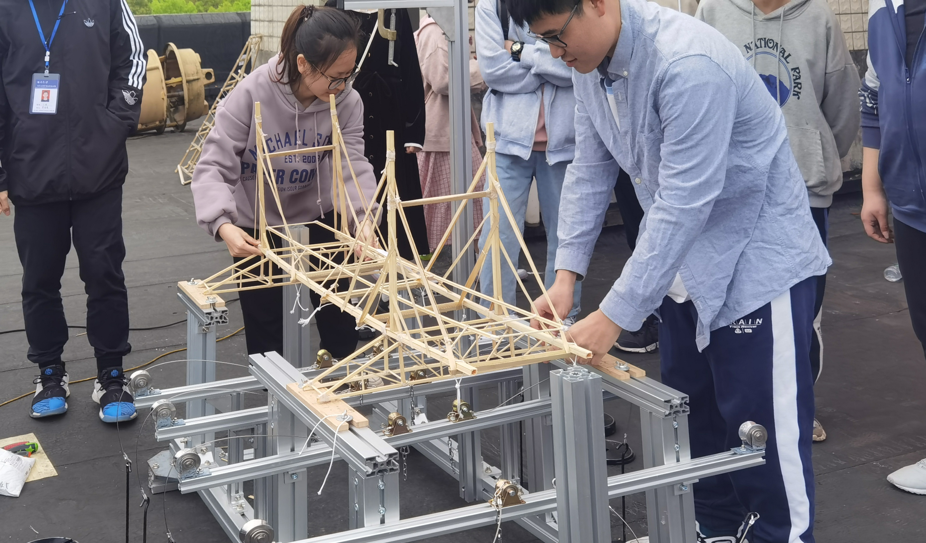 活动伊始,工作人员对每个模型进行称重、测量桥下净空并记录数据,以确保比赛的公平性。竞赛过程中,陶秋旺老师和伍琼芳老师进行技术性指导,规范参赛人员的操作,并对同学们的加载试验和结构模型提出相关意见。同时,陈振富书记和唐素芝副书记莅临指导,他们对同学们制作的模型表示肯定,各参赛同学在得到老师们的鼓励后信心倍增,活动氛围也因此更加的浓烈。此次的活动过程虽突然降雨,但现场的工作人员依旧有条不紊地让竞赛选手编码进行测量和加载试验,最终,活动成功落下帷幕。
