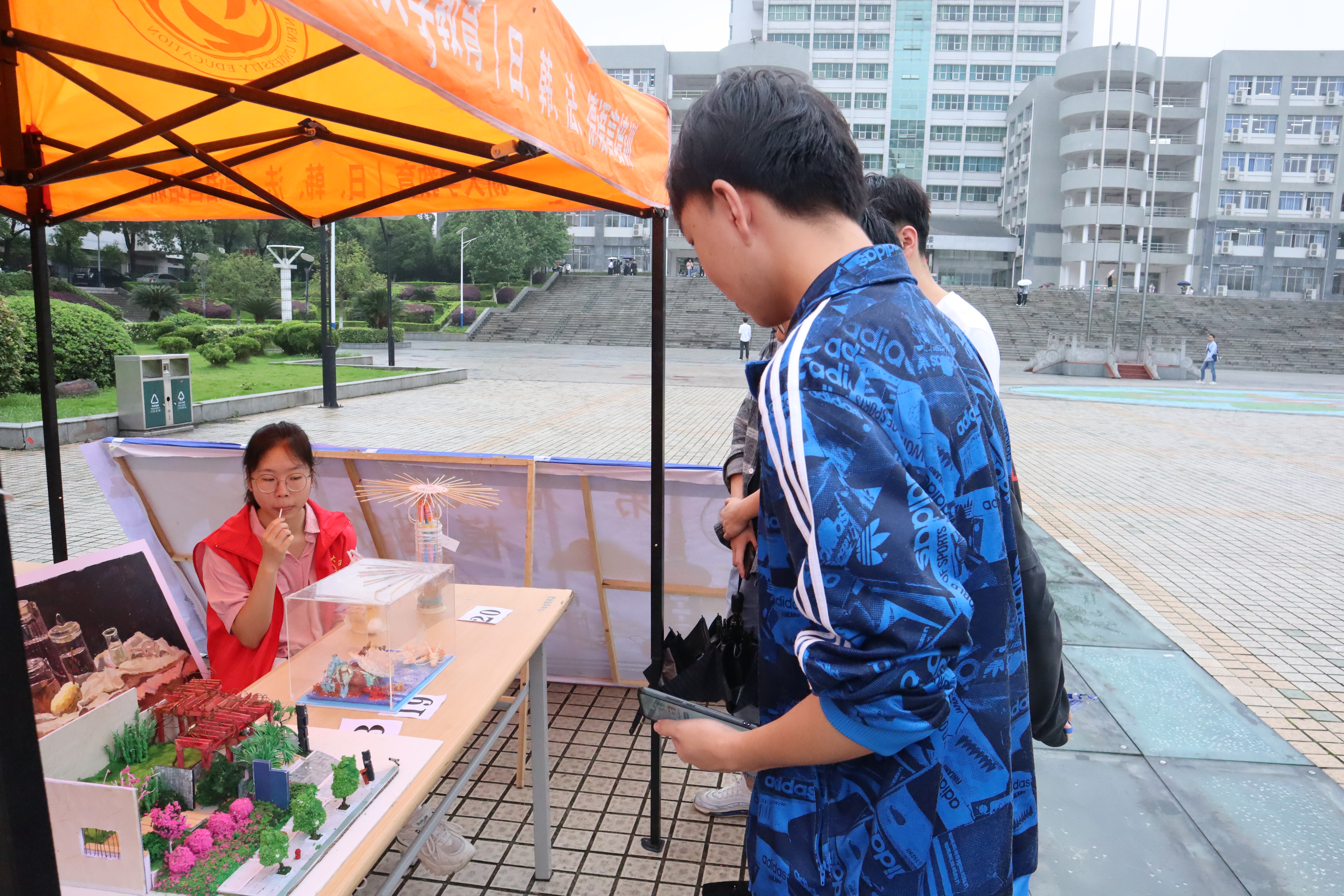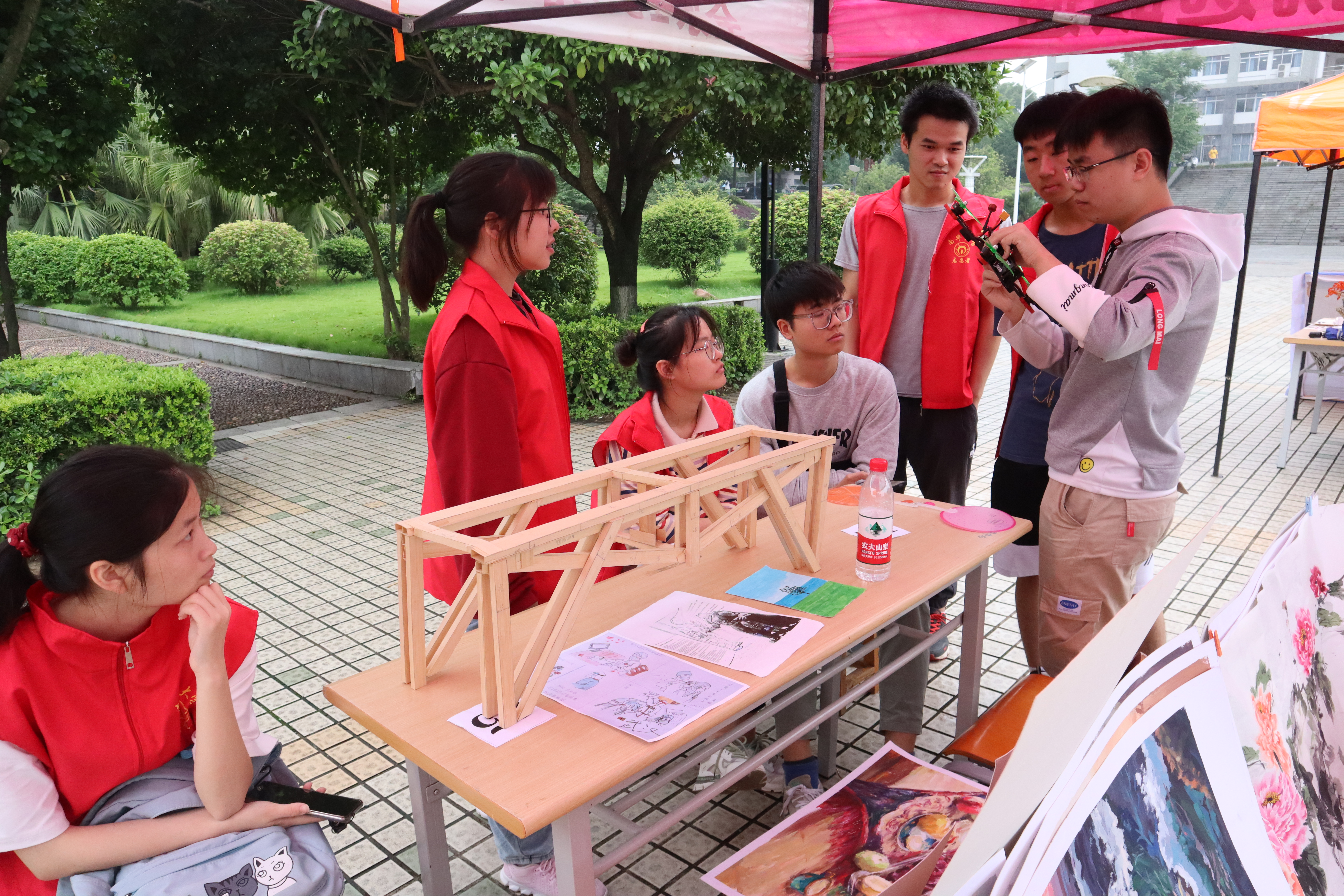 活动初,志愿者们将展品依次摆放在展台上,并为前来观看展品的同学进行相关解说。展览共计展出几十余件展品,其中有来自设计艺术公司的展品《绿萝》、《思念杨某》等画作,来自MK体育的“金州大桥”、“中国红大桥”、“框架大桥”等一系列桥梁模型,来自机械公司的无碳小车和机器人模型,以及其他公司的众多优秀作品。模型具有温厚的质感,或格物致知的追求、或天马行空的想象,让参观者大饱眼福,同学们一边仔细欣赏着作品,一边认真倾听志愿者对作品的诠释,大家在对每个模型充满好奇之余,更是对创作者扎实的专业知识以及丰富的想象力和创造力感到无比惊叹。随着时间临近结束,天空下起小雨,参观的同学们逐渐离场,至此,活动圆满结束。