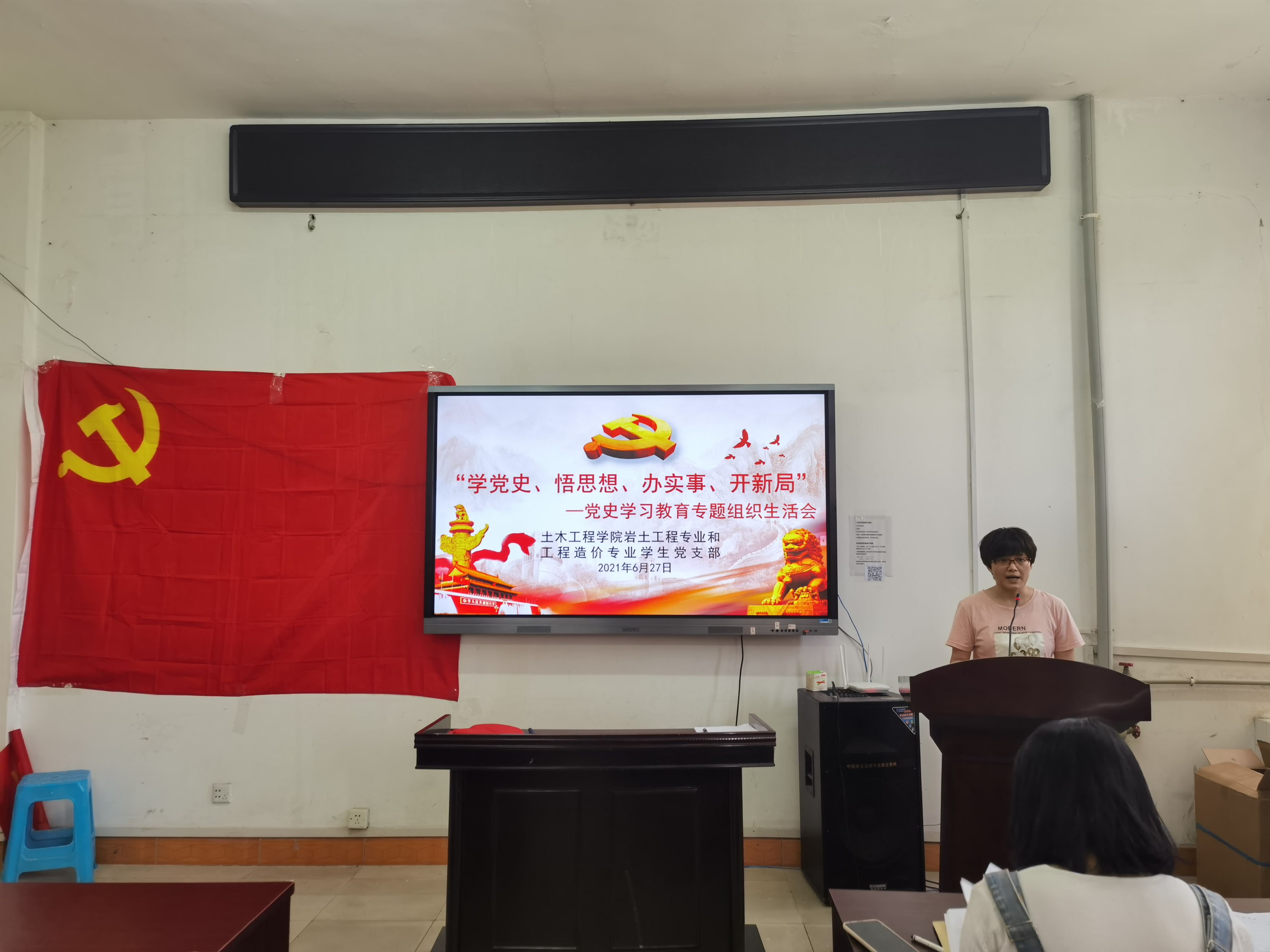 2021年6月27日15:00,MK体育岩土工程专业和工程造价专业员工党支部在土木楼四楼会议室召开“学党史、悟思想、办实事、开新局”党史学习教育专题组织生活会,会议由支部书记李翠新老师主持,支部全体党员参加。