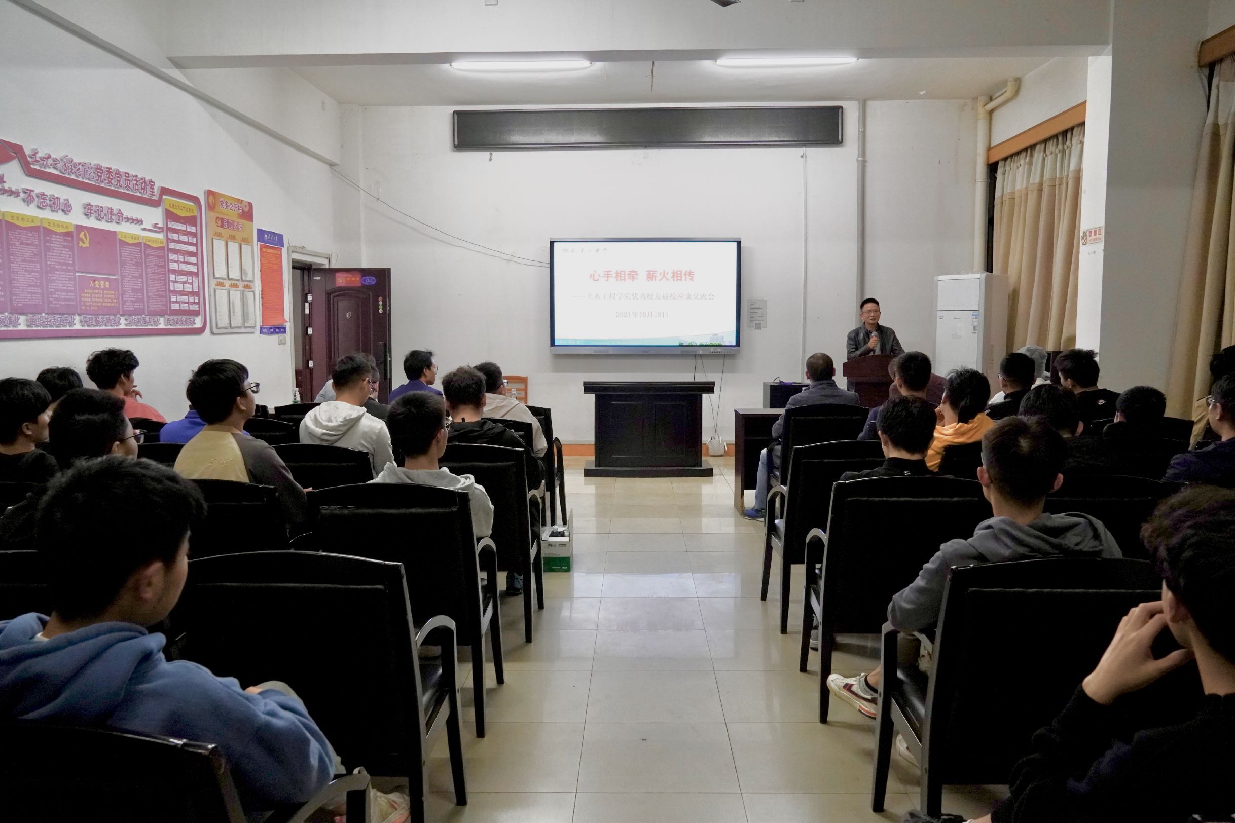 2021年10月18日晚八点,“心手相牵,薪火相传”MK体育优秀员工返校座谈交流会在土木楼四楼会议室举行。本次座谈交流会邀请的两位优秀员工分别是深圳建数有限公司总经理李大庆和中铁建港航局行政秘书唐希。岩土专业的部分同学参与了本次座谈会。会议由学工室主任李翠新老师主持。