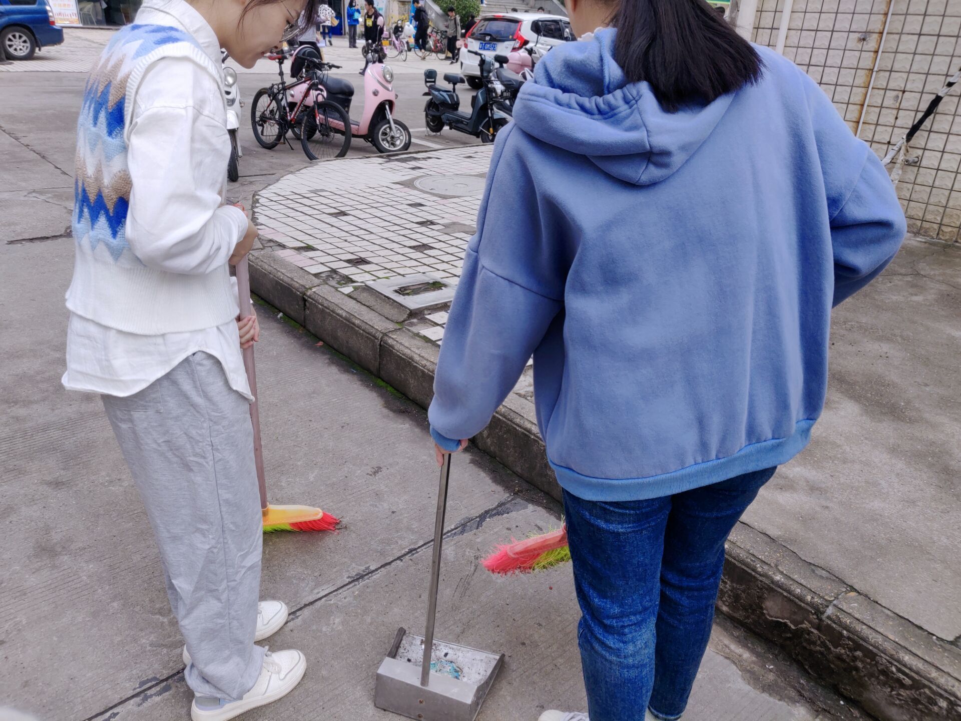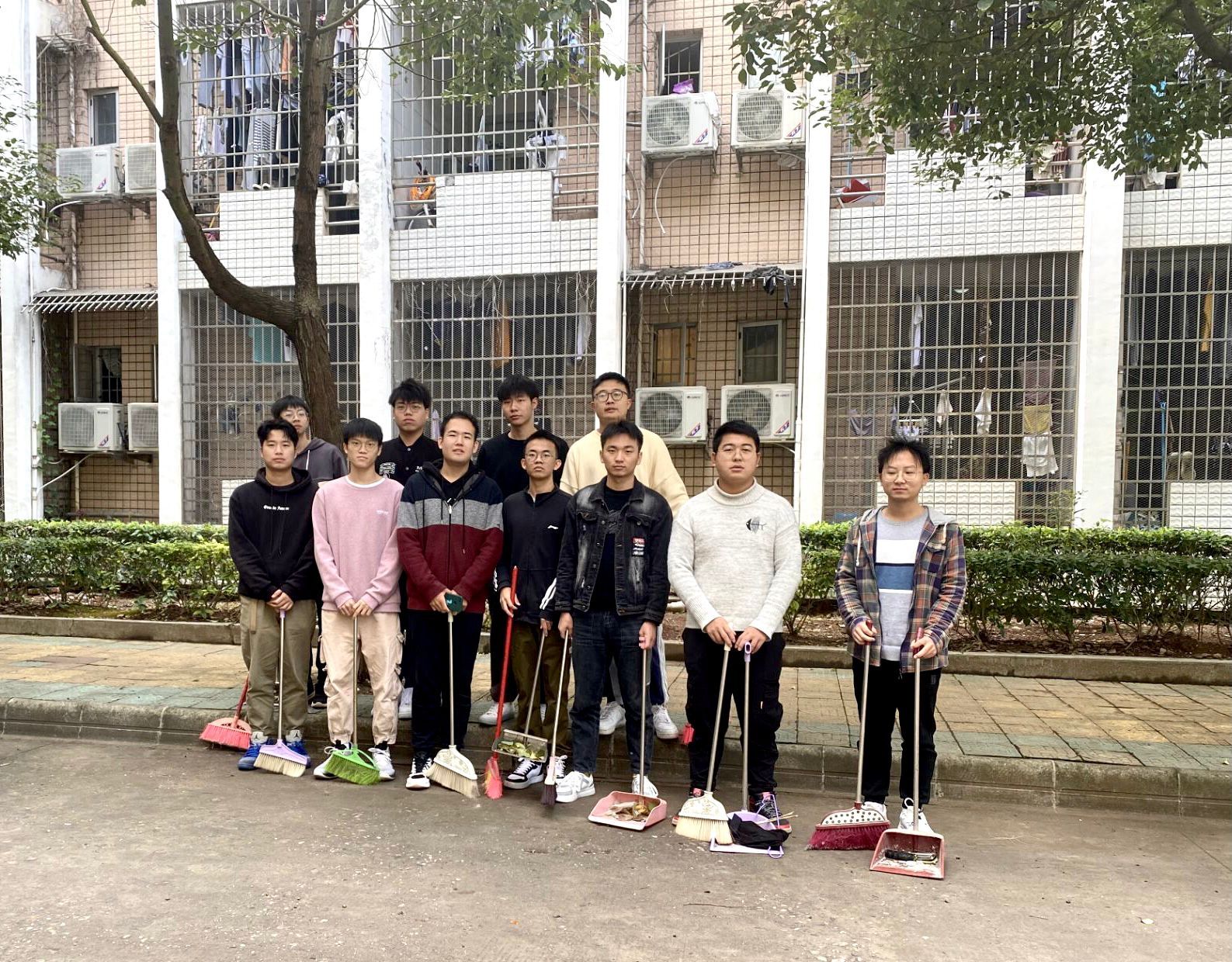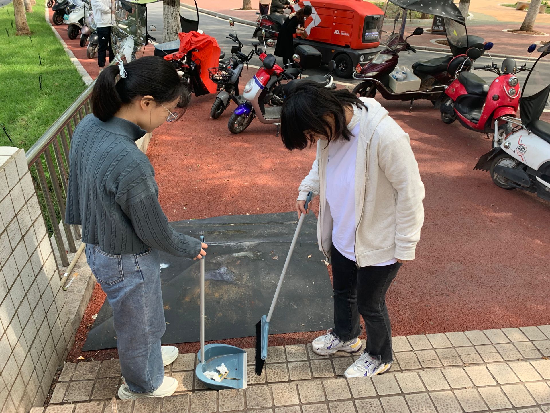 有序集合后,学员们进行了简单分组。研究生党支部学员负责博学园一栋周边的打扫清洁工作,本科生学员分为两组分别负责致远园3栋周边及致远园16栋周边。在党支部有条不紊的组织及学员们齐心协力的沉稳工作下,实践活动所负责的区域变得整洁卫生,这极大地减免了校内部分工作人员平日的繁重清洁工作,并以自身实践向校园内的大家呼吁了共同守护校园整洁卫生。不少同学都响应了号召,见到辛勤工作的学员们自发地前来帮忙并为他们献上了鼓励与肯定的掌声。