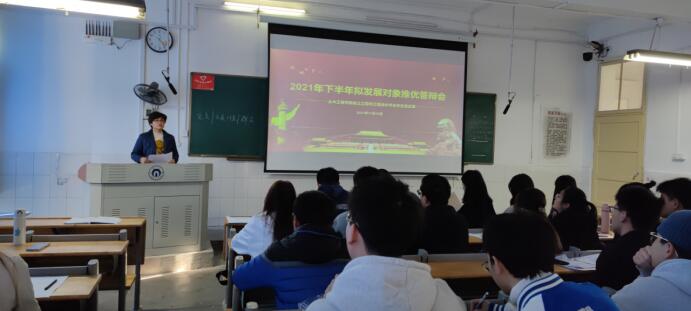 本次会议分为支部书记讲话、发展对象汇报答辩、党员自由推荐、投票推荐四个环节。首先,支部书记李翠新老师强调了召开答辩会的目的、要求和流程。随后,发展对象分成5组进行个人陈述和现场答题,他们依次汇报了自己的思想政治表现、现实表现、作用发挥等方面的情况,在肯定自己取得成绩的同时也反思了自己的不足,接着由小组代表随机抽取一个题目,发展对象依次现场答辩。与会人员根据发展对象汇报及答辩情况,本着严肃负责的态度进行评议推荐,并通过无记名投票方式进行推选,最后确定李嘉斌等20名同学为2021年下半年拟发展对象,报上级党组织预审。