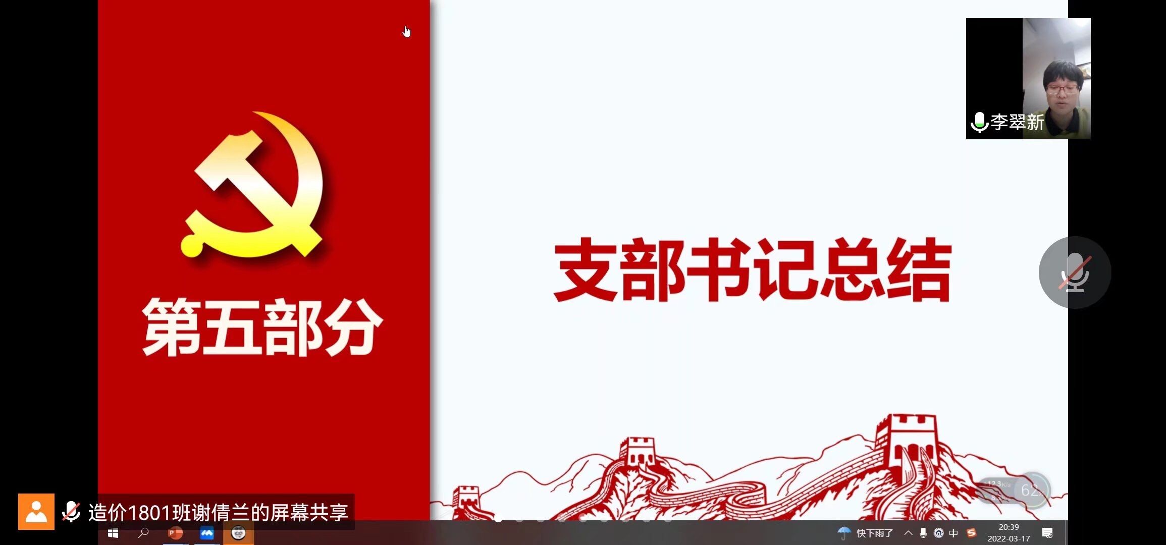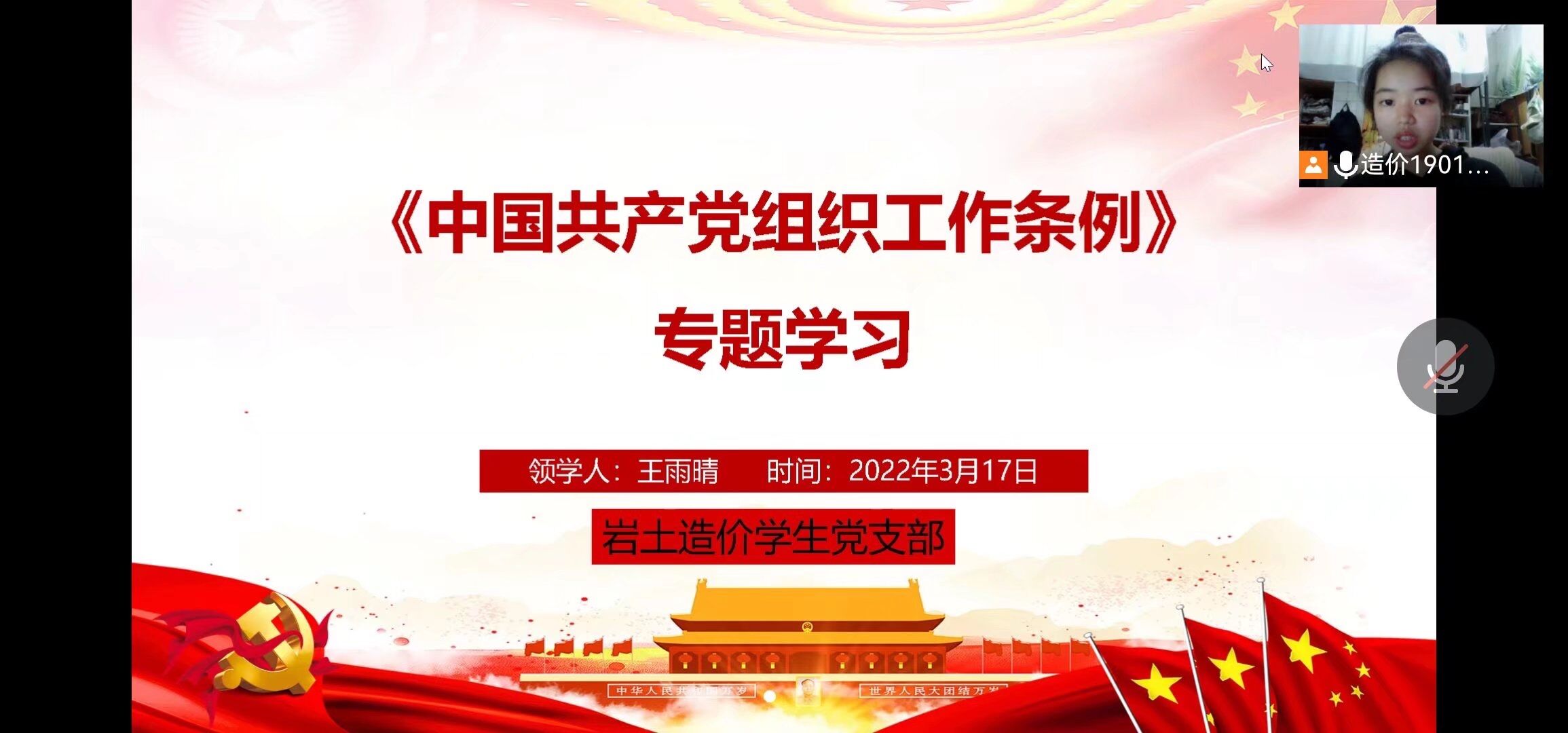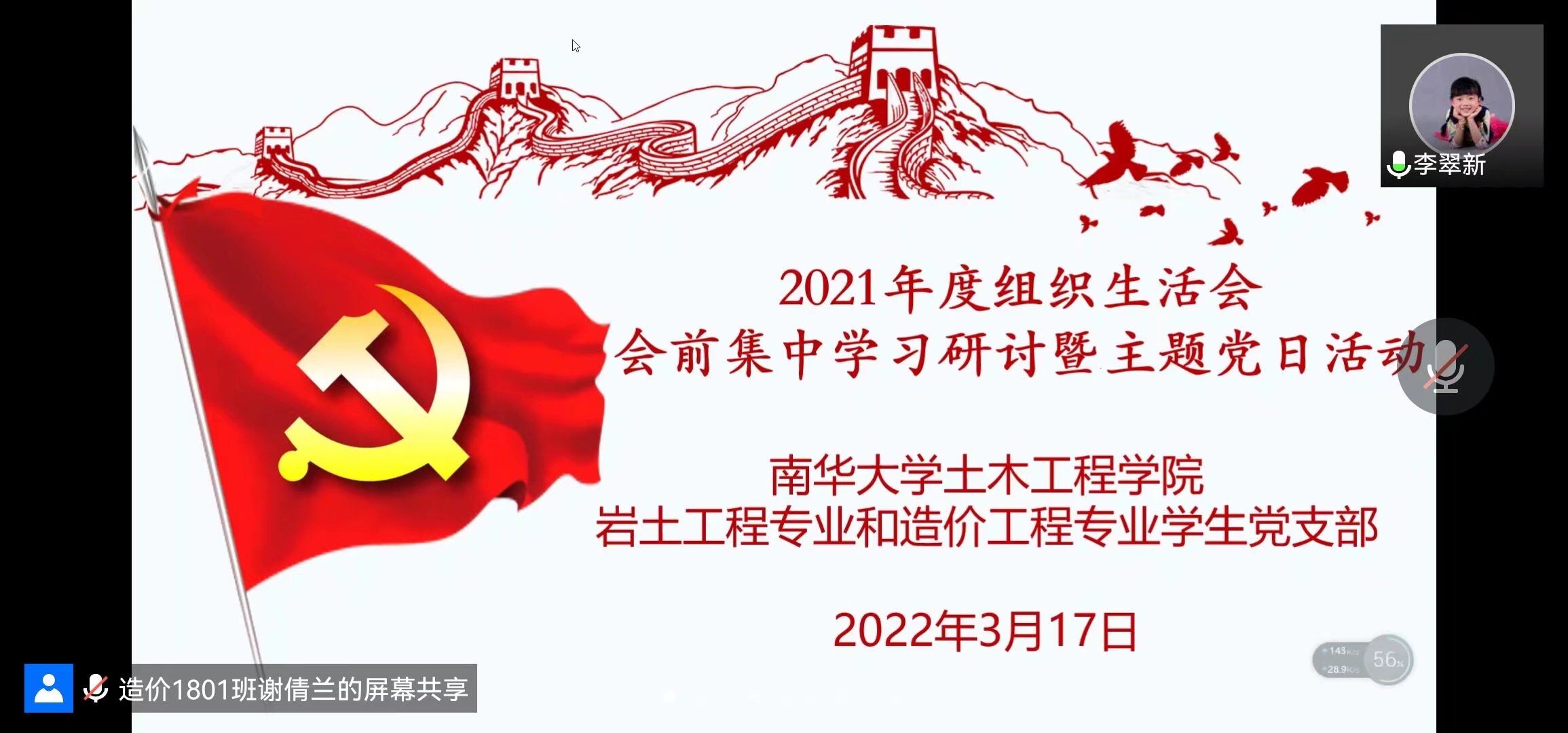 2022年3月17日19:30,MK体育岩土工程专业和工程造价专业员工党支部通过线上方式开展2021年度组织生活会会前集中学习研讨暨主题党日活动,活动由支部副书记谢倩兰同志主持,支部书记李翠新老师和全体党员参加。