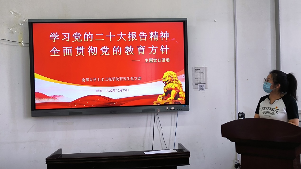 活动第二部分,第七党支部副书记胡娟同志带领大家系统解读了党的二十大报告精神。主要从“过去五年的工作和新时代十年的伟大变革”和“开辟马克思主义中国化时代化新境界”等十五个方面阐述了大会主题:高举中国特色社会主义伟大旗帜,全面贯彻新时代中国特色社会主义思想,弘扬伟大建党精神,自信自强,守正创新,踔厉奋发,勇毅前行,为全面建设社会主义现代化国家、全面推进中华民族伟大复兴而团结奋斗。