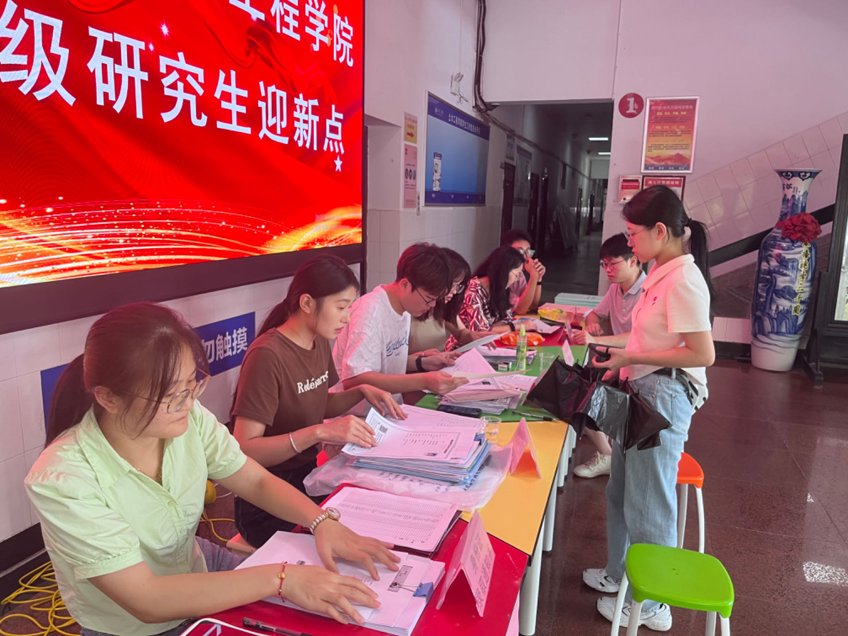 为确保新生顺利入学报到,全体工作人员全情投入,用温馨的服务让2023级研究生切实感受到公司的温暖和关怀。迎新工作点设在公司东侧一楼大厅,志愿者全天在此处值班,积极为新生引导路线、答疑解惑。领导们亲临现场指导迎新工作。新生到达接待点后,按要求提交录取通知书、学历认证报告及毕业证学位证复印件等资料。提交资料后进行签到,领取校园卡及学术记录本。顺利完成报到手续、宿舍安排和各种学习准备。