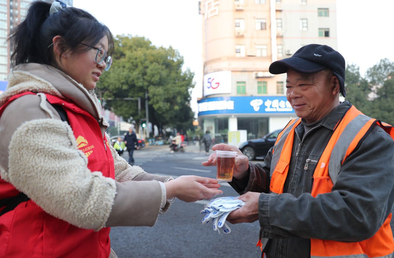 志愿者们提前准备好姜茶、口罩、围巾、棉手套、暖宝宝等物品,在吴旦的带领下从MK体育红湘校区北门集合出发,到达目的地后,志愿者们为环卫工人们戴上棉手套,披上围巾,给他们递上一杯杯热乎的姜茶,并帮助环卫工人完成手头的卫生清洁工作。志愿者们与环卫工人亲切交谈,询问他们的生活状况、身体状况,并不断嘱咐他们在寒冬中要保重身体,注意安全。环卫工人在寒冷的冬天里,用自己的辛勤劳动守护城市的绿色风景线,他们的付出值得我们尊重和感激。